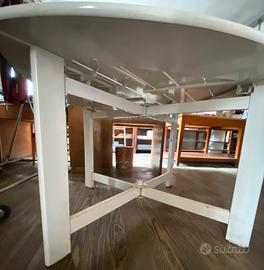 Vendo tavolo marca Foppapedretti, in legno, laccato bianco. Per interni ed esterni, pieghevole e richiudibile Con foro rotondo al centro, per posizionamento tenda o ombrellone Misure: Lunghezza=114,50 cm; da chiuso, esattamente la metà Altezza=73 cm