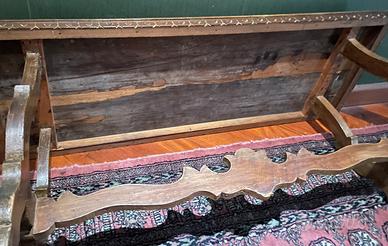 L'esemplare mostrato ha gambe sagomate "a lira",unite da una traversa con un perno in legno.