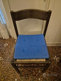 Sedie in legno con seduta in paglia intrecciata, complete di cuscini.