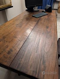 Vendo splendido tavolo in legno massello dallo stile rustico, ideale sia come ampia scrivania per studio/ufficio che come tavolo da pranzo. Il mobile si distingue per il suo carattere autentico, con un piano robusto che mette in risalto le venature naturali del legno e una base a "fratino" con traverse lavorate.