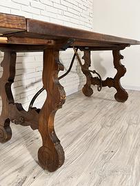 Tavolo fratino artigianale rettangolare in castagno, metà '900, con gambe intagliate e saette in ferro.