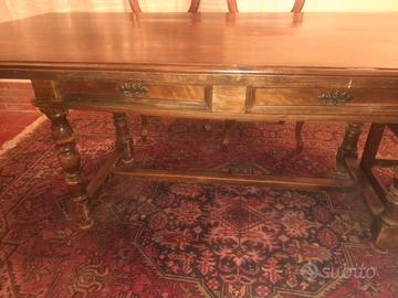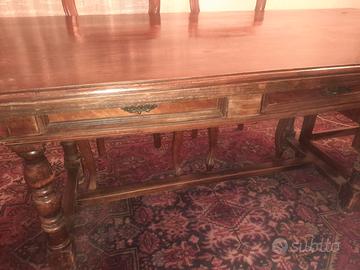 Elegante tavolo stile fratino 8/10 posti a sedere realizzato interamente in legno di castagno massello, perfetto per salone, taverna, area conviviale. Il piano realizzato con antiche tavole di castagno in perfette condizioni con bordo a becco di civetta e sotto il piano sono presenti 2 grandi cassetti