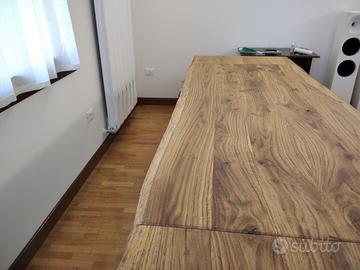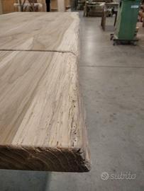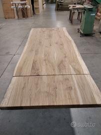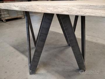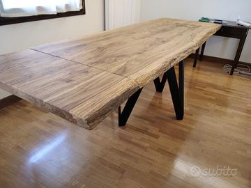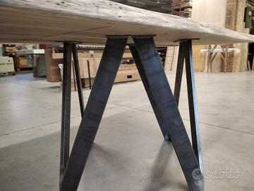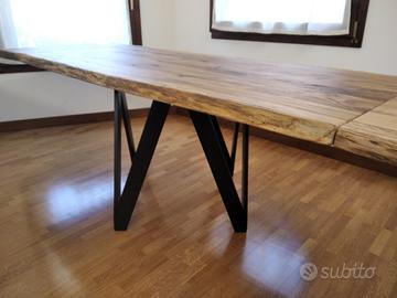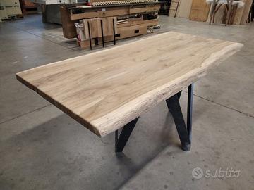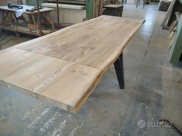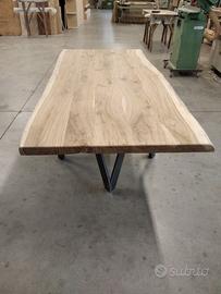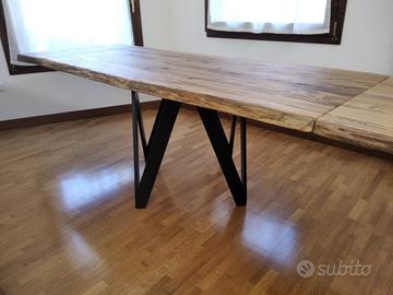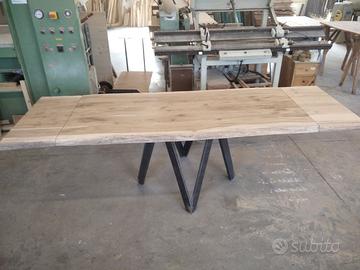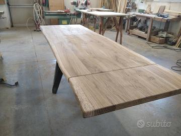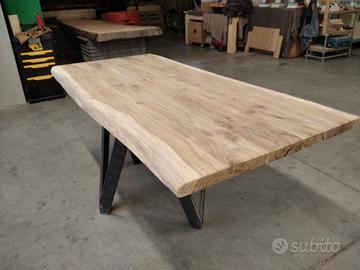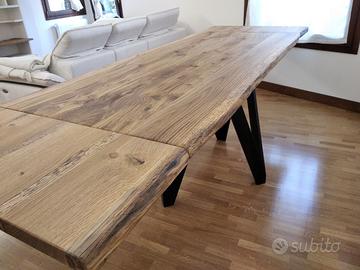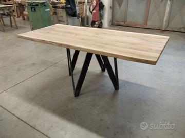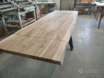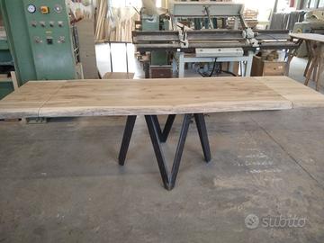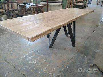 tavolo in legno di ROVERE MASSELLO RUSTICO con qualche crepo e spaccatura che poi verrà stuccata nero opaco, spazzolato con misure lunghezza 200 prof. 90 h 80 con spessore top finito 5 cm con 2 allunghe esterene (mantenendo la stessa venatura continuativa di 40 + 40 per arrivare ad una lunghezza totale di 280 x 90 (allunghe esterne da inserire con 3 baionette e una volta che non si usa lo si ripone in un angolo della casa) con i 2 bordi laterali smussati e scortecciati irregolari, mentre i lati corti dritti lineari. Le gambe saranno costruite in ferro con tubolare 8x1,5 in modo da renderlo leggero ma allo stesso tempo stabile, e la disposizione delle gambe a M/W INCLINATO in cui il tubolare sarà saldato uno appoggiato a fianco dell'altro sotto chiuso e applicato gomma per appoggio a terra e sopra piastra con fori viti per fissaggio al top verniciato finitura nero opaco. Unione delle tavole con anima interna nascosta e sotto alcuni tagli per snervare la venatura in modo che non si muova nel tempo. il piano verrà lucidato con effetto grezzo naturale trasparente (che non altera il colore) impermeabilizzato in modo che non penetri liquidi all'interno del legno e sul ferro una finitura nero opaco. il tavolo è già stato costruito su commissione ed esigenze del cliente, non è disponibile a magazzino ma essendo i diretti produttori falegnami possiamo riprodurlo uguale o in base alle proprie esigenze. per domande o dubbi contattateci P.S. disponibili a dare suggerimenti o chiarimenti in merito, per noi conta dare vita al vostro sogno DIRETTAMENTE DAL PRODUTTORE ASTENERSI RIVENDITORI O COMMERCIANTI