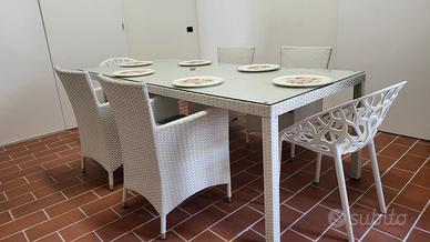 TAVOLO IN RATTAN 6 POSTI - 220X100 cm - COLORE BIANCO con VETRO TEMPERATO 5 mm 4 SEDIE IN RATTAN COLORE BIANCO CON CUSCINO COLORE GRIGIO (comodissime) DA ESTERNO - VENDO PER CAMBIO CASA SET COMPLETO PAGATO 980 euro