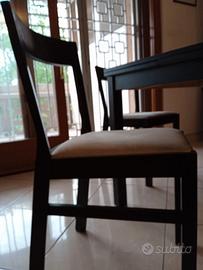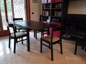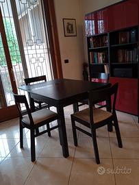 tavolo in legno 90x90x74 allungabile su due lati a 129 e 178 marrone nero 4 sedie in legno marrone nero con sedile foderato grigio chiaro