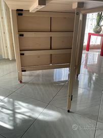Vendo tavolo IKEA pieghevole in legno chiaro, ideale per cucina, sala da pranzo o studio. Il tavolo è dotato di 6 cassetti centrali molto comodi per riporre utensili, tovaglie o piccoli oggetti.