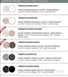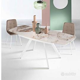 Tavolo allungabile con due allunghe da 35 cm; base in metallo verniciato e piano in pietra sinterizzata effetto marmo.