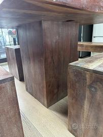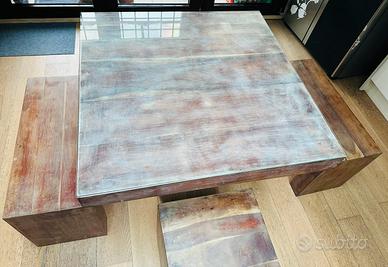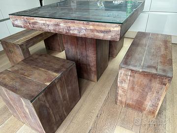 Tavolo il vero legno di noce scuro e 4 panche Legno massello molto resistente e copertura in vetro Dimensioni 1m x 1m 4 panche di cui 2 a forma di cubo e 2 rettangolari Come nuovo