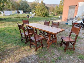 Tavolo impero con 6 scranni in noce e cuoio