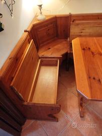 Tavolo con panche in legno di abete. Le panche si aprono, il tavolo è allungabile.