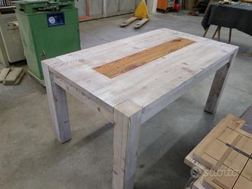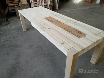 tavolo in abete nuovo massello spazzolato con misura lunghezza 160 larghezza 90 altezza 79 con gambe in pezzo unico direttamente da travetto da 12 x 12 e piano spessore 4 cm. verrà tolto qualsiasi tasche di resina e i vari nodi. 2 allunghe in massello di abete con lunghezza 50 cm cadauna circa che troveranno posto sotto al piano nell'apposito cassetto x arrivare ad una lunghezza totale di 260 circa. Fascia centrale del tavolo con inserimento di lamella in legno di abete vecchio che verrà tenuto al naturale trasparente. Il sistema di apertura sarà supportato da profili in alluminio estruso con carrelli che scorreranno al suo interno su cuscinetti con blocco di apertura e chiusura del tavolo con portata 120 kg. Gambe smontabili per agevolare il trasporto. Sotto al piano e alle allunghe verrà incassato un ferro a T in modo da mantenere più dritto possibile legno. Unione del tavolo con spine in legno e barilotti con perni. Lucidatura sbiancata 2 componenti per una totale impermeabilizzazione del tavolo. costruito su commissione ed esigenze del cliente, non è disponibile a magazzino ma essendo i diretti produttori falegnami possiamo riprodurlo uguale o in base alle proprie esigenze. per domande o dubbi contattateci P.S. disponibili a dare suggerimenti o chiarimenti in merito, per noi conta dare vita al vostro sogno DIRETTAMENTE DAL PRODUTTORE ASTENERSI RIVENDITORI O COMMERCIANTI