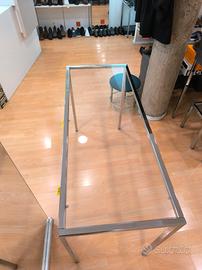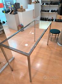 vendo tavolo in acciaio cromato e vetro, misura 150 x 60 H 92, con piedini antivibrazioni e regolabili, pianale in vetro con supporti in acciaio rivestiti in gomma, perfetto e bellissimo, ideale per arredare casa o anche qualche vetrina di negozio o studio