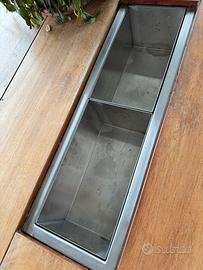 Tavolo in acciaio inox e legno. Misure: 200 cm x 100cm. Altezza 77 cm. Struttura in acciaio inox. Piano in legno con apessore 3,5 cm. Dotato di vascone centrale in acciaio inox e 4 vaschette, sempre in acciaio inox, per ghiaccio.