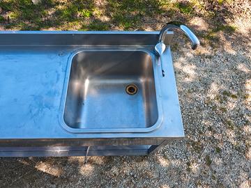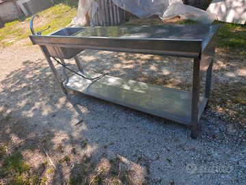 Tavolo in acciaio Inox con alzatina altezza regolabile con lavandino incassato. Profondità 50 cm con alzatina, altezza 85 cm con gambe regolabili, larghezza 192 cm, rubinetto miscelatore incluso, vasca 40cm x 40 cm, profondità vasca 25 cm.