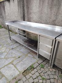 tavolo in acciaio inox 270 x 70 x 90 grande e comodo per cucine esterne grill angoli cottura, utile anche per cucine professionali o laboratori. compreso di tre comodi cassetti e ripiano basso, solido in buone condizioni. no spedizione solo ritiro in loco.