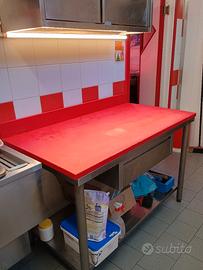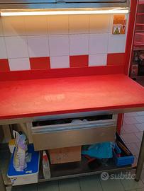 tavolo in acciaio con cassetto e ripiano, con piano in teflon rosso misure cm 160x 80