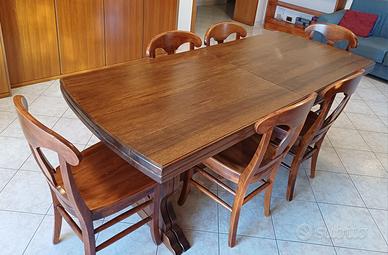 Tavolo in legno massello impiallacciato in noce tanganica dimensioni 203x86, allungabile con due aggiunte fino a 263 cm. Fornito con 7 sedie. Trattamento antitarlo eseguito su tavolo e sedie.