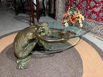 opera darte antica raffigurante un nudo di ragazzina che dorme con la testa appoggiata sulle gambe e con le braccia sorregge questo piano in cristallo infinito