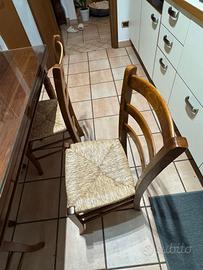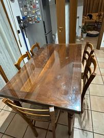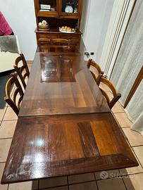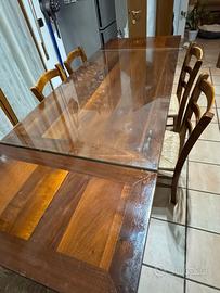 Tavolo stile arte povera in legno di ciliegio dimensioni 140*80 (6 posti a sedere), allungabile con prolunghe scorrevoli ed integrate fino a 225 cm. Il prezzo include la lastra di vetro tagliata misura a protezione della piana e 6 sedie con impagliatura inteamente rifatta.