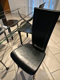 Tavolo con piano in cristallo (alto 2 cm), misura cm 210x100 e piede formato da vecchia branda militare (originale prima guerra mondiale) in ferro battuto trattata a cera, completo di 4 seggiole in vero cuoio , prodotto artigianalmente.