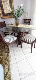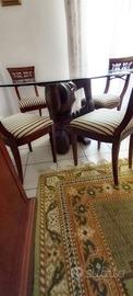 Per motivi di spazio, vendo tavolo con piano in puro cristallo e base unica con scultura in legno massello di uomo inginocchiato che sorregge il piano, realizzato in unico blocco di legno (PEZZO UNICO) + 4 sedie con seduta imbottita tutto in perfette condizioni (come nuovo)