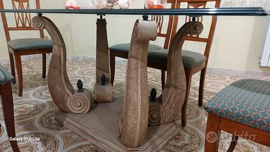 vendo tavolo in cristallo con base in marmo di Carrara e 6 sedie. le dimensioni del tavolo sono 108×220 cm. Le 6 sedie con imbottitura intatta, così come tutte le parti in legno