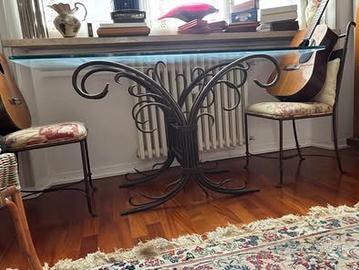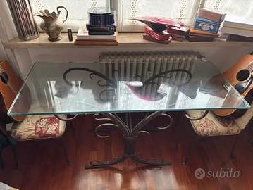 Tavolo in cristallo con base in ferro battuto