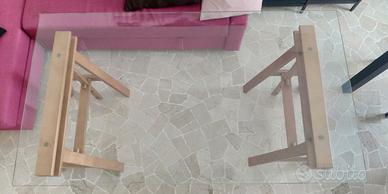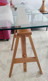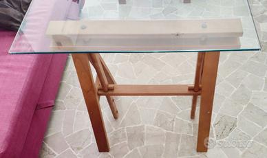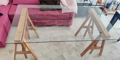 Tavolo in cristallo temperato con cavalletti in legno massello, si può usare come scrivania, i cavalletti sono regolabili in varie altezze, ottimo stato. Misura cristallo 162x90