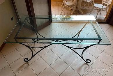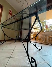 Tavolo in cristallo con base in ferro battuto, dal design elegante e raffinato. Perfetto per ospitare 6/8 persone, questo tavolo misura 90 cm di larghezza, 160 cm di lunghezza e 74 cm di altezza, rendendolo ideale per una sala da pranzo o un soggiorno. Il piano in cristallo conferisce un tocco di leggerezza e modernità, mentre la solida struttura in ferro battuto aggiunge un carattere classico e robusto. Presenta alcuni graffi sul piano, visibili solo da vicino, che non compromettono l'estetica complessiva del tavolo.