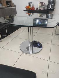 Tavolo in cristallo con piede in acciaio da 4/6 posti chiuso e 8/10 posti aperto. Chiuso è quadrato da 113cm, aperto è ovale. In buone condizioni. Sedie in regalo.