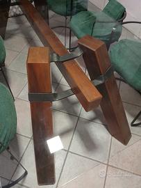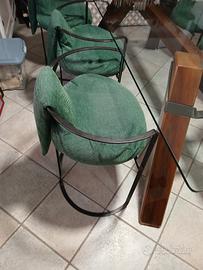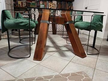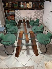 Tavolo in cristallo con base in noce massiccia e 6 sedie in ferro battuto. Vendo anche le sedie separate dal tavolo.