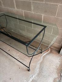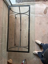 La base è in ferro battuto, realizzata a mano, verniciata scura, costruita con archi curvi che si incrociano e creano un motivo doppia C. Sotto, una struttura di rinforzo con aste longitudinali e traversa centrale irrigidisce l’insieme, mentre i piedini (con appoggio rotondo) aiutano la stabilità anche su pavimenti non perfettamente in bolla.