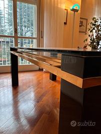 Tavolo in cristallo da 18 mm con struttura in ottone e gambe laccate nere.