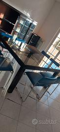 Tavolo in ferro e cristallo. Quadrato 140x140. Con 8 sedie in pelle azzurra. Trasporto a carico dell'acquirente.