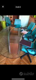 Tavolo in cristallo da ufficio, ovale, in cristallo temperato, con base in legno di ciliegio e struttura in acciaio.