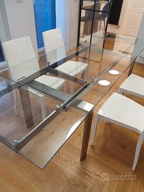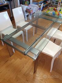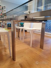 vendo tavolo in cristallo e gambe in acciaio satinato dimensioni da chiuso 160x85cm, con le due allunghe aperte diventa lungo 240cm. ottimo stato. ritiro in zona Roma Eur.