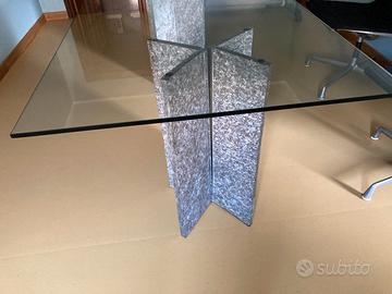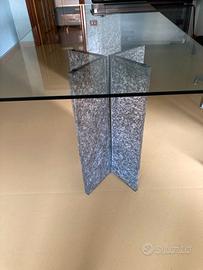 tavolo in cristallo supportato da basi in pietra rifilate sull'esterno con bordura in acciaio - si presenta in ottime condizioni (cè una mini imperfezione su bordura inferiore - poco visibile) - NON si effettua la spedizione ma solo consegna sul posto (pressi di Torino)