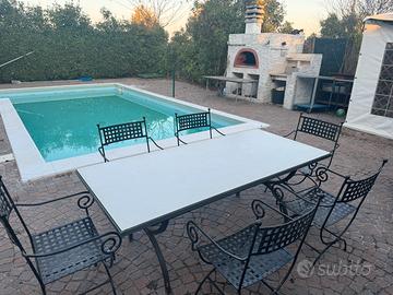 Tavolo di 2m x 1 in ferro battuto con piano lucido in granigliato di marmo. Compreso