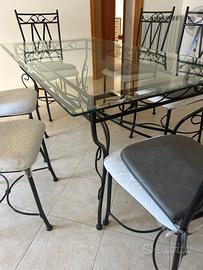 Tavolo in ferro battuto con vetro temperato. 6 sedie imbottite da ricoprire per danni dovuti al tempo