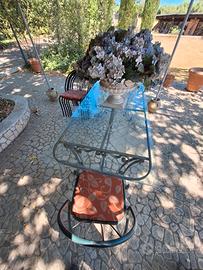 Set composto da un - tavolo in ferro batutto e piano in cristallo - 6 sedie in ferro