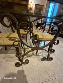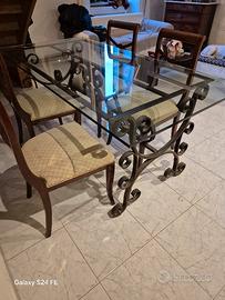 Tavolo con ripiano di cristallo in ferro battuto inchiodato e non saldato. Comprensivo di quattro sedie.