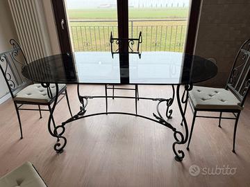 Tavolo in ferro pieno battuto,forgiato a mano da un fabbro di Lodi nei anni 90 Il vetro temperato presenta qualche piccoli segni nei suoi anni