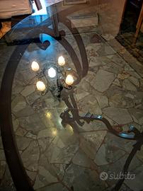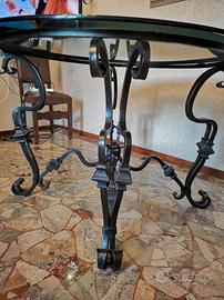 Vendo tavolo in ferro battuto barocco napoletano con piano in vetro fumè. Il diametro del vetro è 120 cm, l'altezza del tavolo è 79 cm.