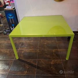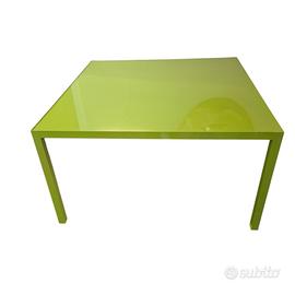 Il vivace colore verde mela della base in ferro è un'aggiunta divertente e unica a qualsiasi arredamento. La forma quadrata misura 130 x 130 cm con un'altezza di 72 cm, rendendolo un pezzo versatile per qualsiasi stanza. Il piano in vetro verde abbinato aggiunge un aspetto coerente al tavolo, creando un'estetica vintage davvero sorprendente.