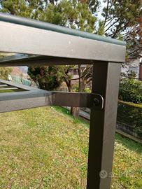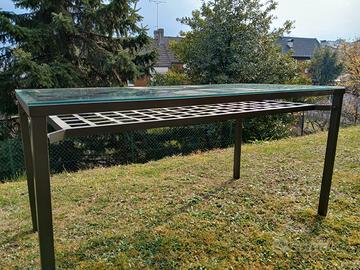 Tavolo in ferro, verniciato testa di moro satinato. Mensola sottostante come da foto e piano in cristallo trasparente 6mm. Misure 150x78x h75cm. Ideale per casa o veranda. Smontabile, eventuale possibilità di trasporto in zona Trento.