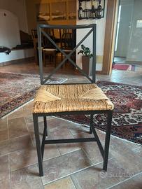 Vendo originalissimo tavolo in ferro con piano in vetro + 6 sedie in ferro con seduta in paglia Misure tavolo: larghezza cm 78, lunghezza cm 146, altezza cm 76. Misure sedie: cm 40x40x46. Altezza schienale cm 86