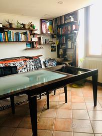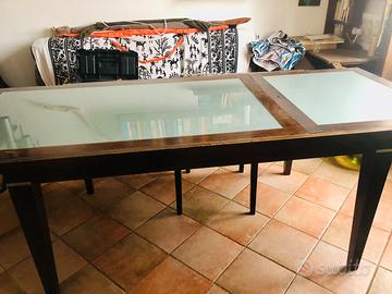 Tavolo in legno 152x96 allungabile di altri 75 cm. Legno scuro con ripiano in vetro satinato. Molto stabile. Qualche riga da usura sul legno. No spedizione.