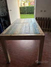 Bellissimo TAVOLO IN LEGNO A DOGHE MULTICOLORE MISURA mt.1,60lunghezza cm. 80 di larghezza cm.76 di altezza, le zampe sono di spessore cm. 7 per 7 cm ; ben strutturato come si può vedere dalla foto fatta dal sotto tavolo