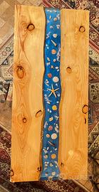 Piano composto da due tavole laterali in legno massello di abete, spessore 4 cm. Fiume centrale in resina epossidica extra trasparente con inserimenti di conchiglie e stelle marine su fondale blu oceano