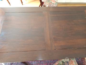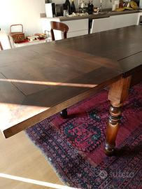 Tavolo rettangolare allungabile con allunghe laterali estraibili, detto anche con apertura "a tiro", Prolunghe laterali e piano smontabili, gambe tornite.